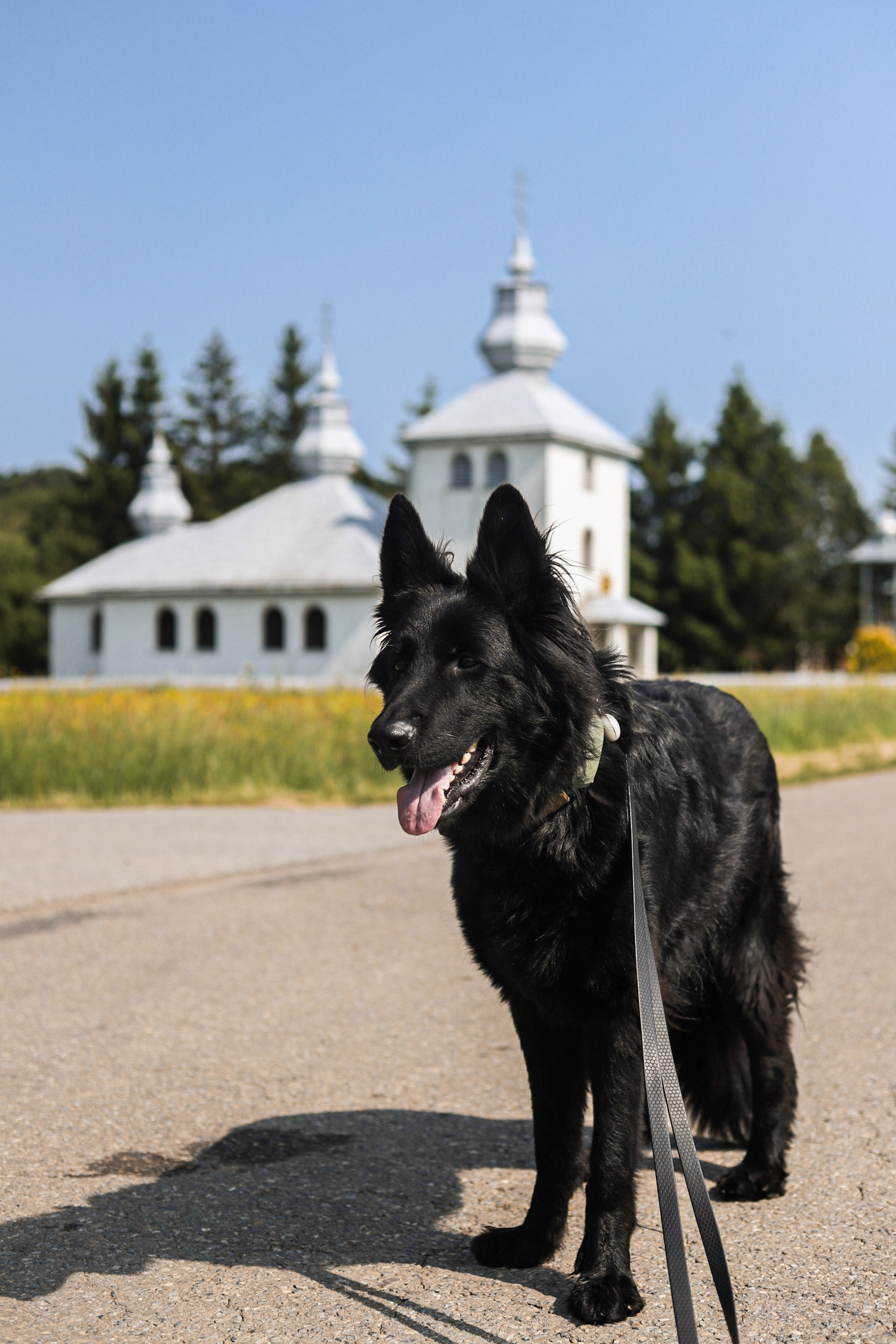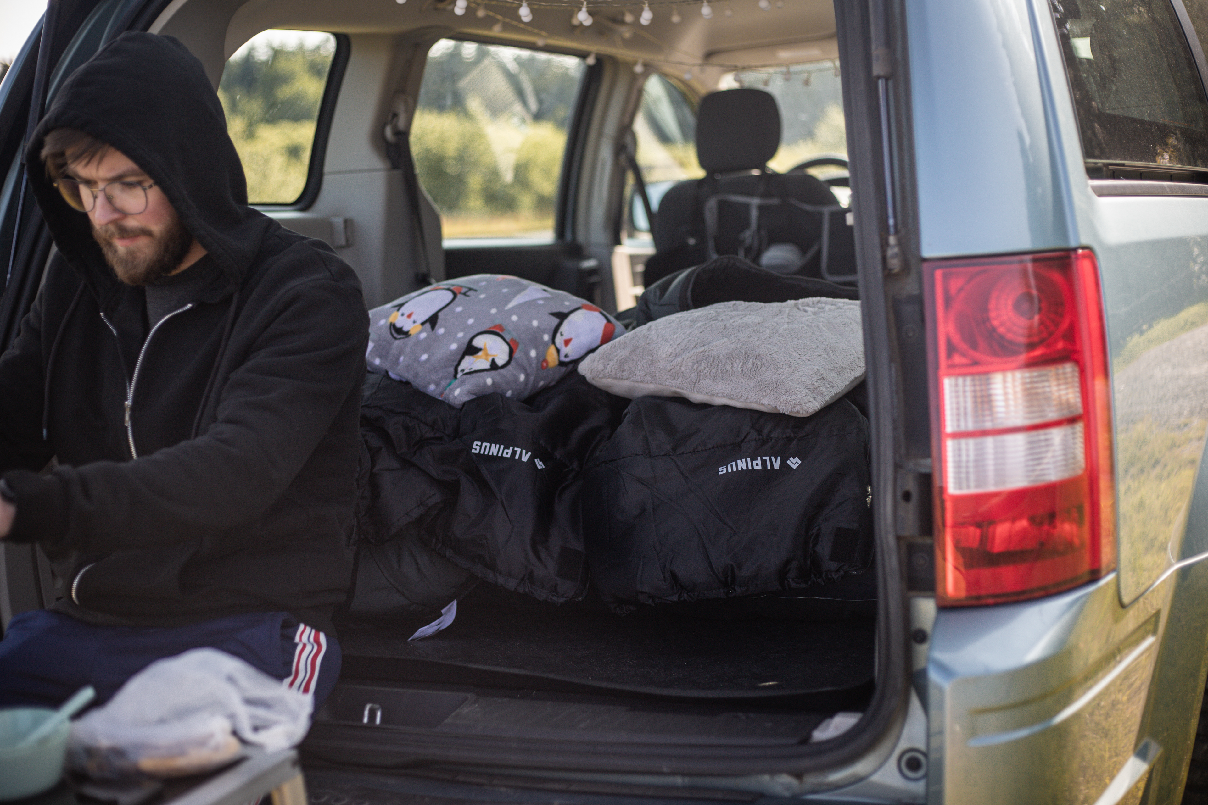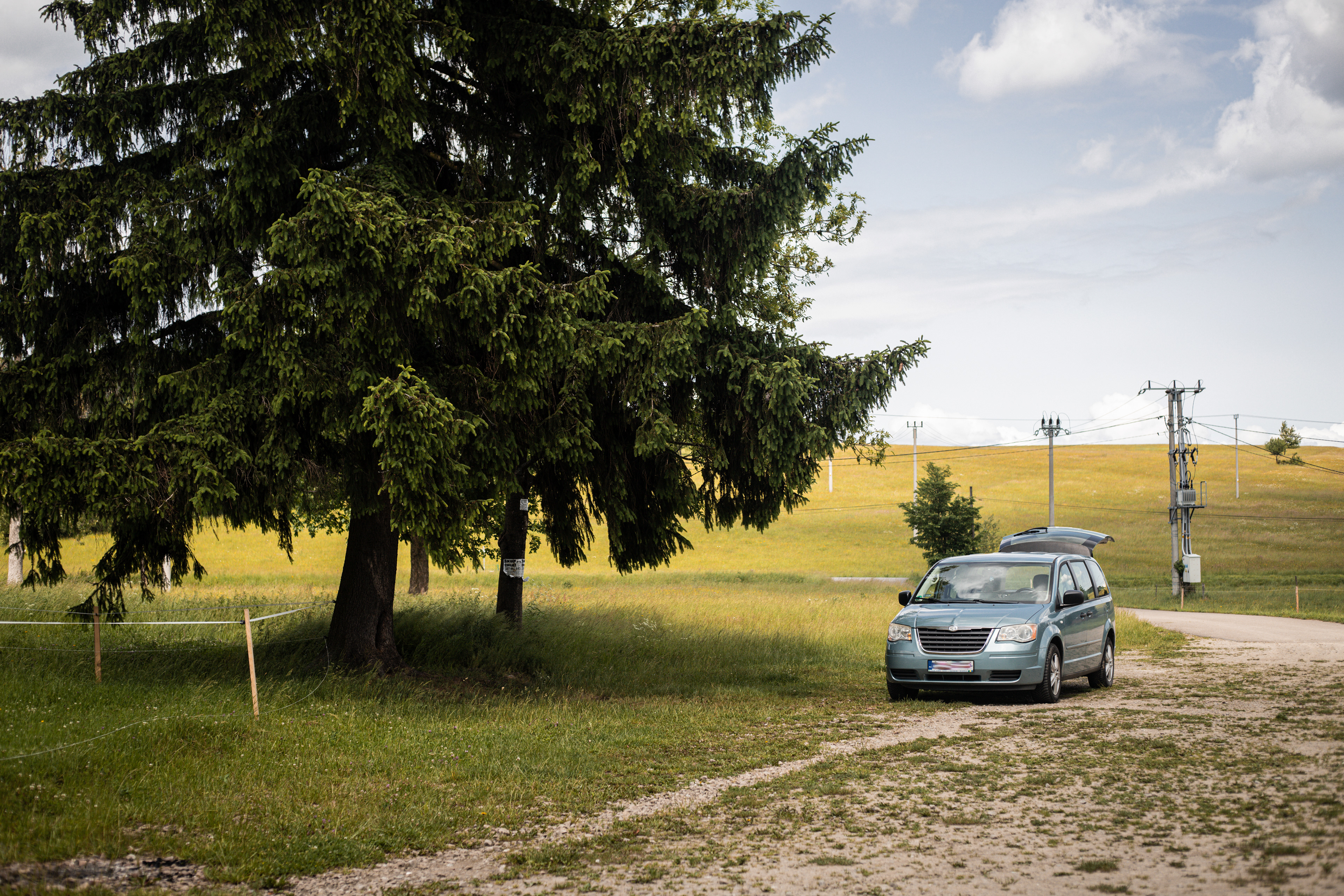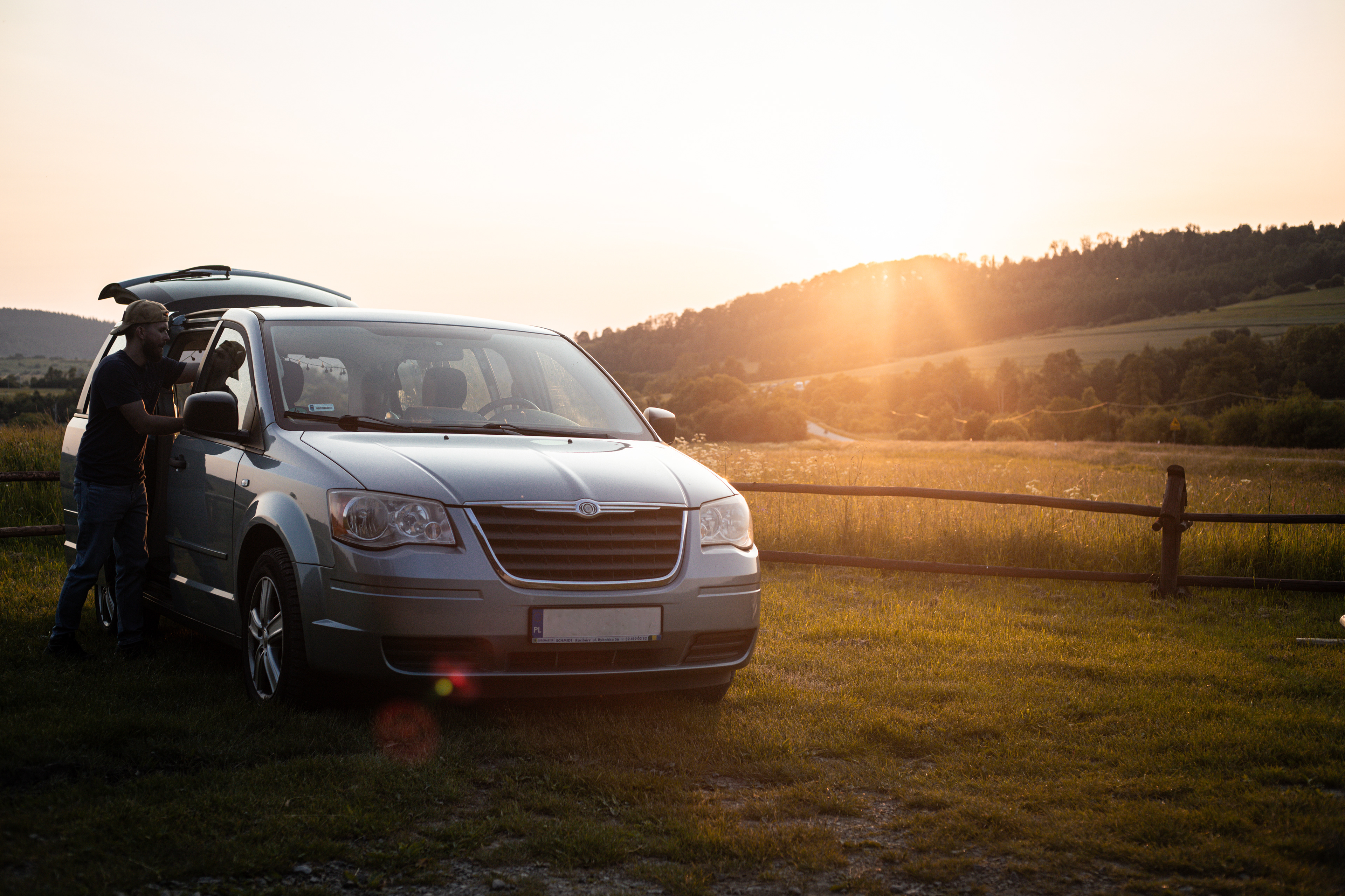 Wolę Niżną odwiedziliśmy, żeby przetestować nasze auto pod kątem noclegowym. Długo szukaliśmy samochodu, który umożliwi nam komfortowe podróżowanie z dużym psem, bagażami i w którym podczas wycieczek będziemy mogli się przespać. Niedawno staliśmy się posiadaczami Chryslera Grand Voyagera i już śmiało możemy powiedzieć, że to auto spełnia wszystkie z powyższych oczekiwań. Bez problemu wchodzi tam na płasko dwuosobowy materac i jest jeszcze sporo miejsca na resztę rzeczy i psiaka - choć ten ostatecznie (zupełnie przez przypadek) znalazł sobie miejsce na naszym materacu. Klatka w nocy stała sobie na zewnątrz, a na czas przygotowywania posiłków była jednocześnie miejscem odpoczynku Ivara i naszym stolikiem. Noc mieliśmy spędzić w miejscu, które wydaje się idealne na tego typu wycieczkę z uwagi na piękny widok, wiatę ze stołami, kosze na śmieci i czystego toi toia :P Okazało się jednak, że jest to dość popularna miejscówka spacerowa i baza wypadowa lokalnej młodzieży - nawet w środku tygodnia. Podjęliśmy decyzję o przejechaniu na parking kilkaset metrów dalej i miejsce, w którym się zatrzymaliśmy - mimo bliskości drogi - okazało się być bardzo przyjemne i wcale nie było głośno, czego początkowo się obawialiśmy. Rano podczas przygotowywania śniadania widzieliśmy, że na poprzednią miejscówkę podjechał autokar pełny dzieciaków, więc jeśli komuś zależy na spokoju i mniejszym ruchu to zdecydowanie bardziej polecamy parking bliżej drogi :)